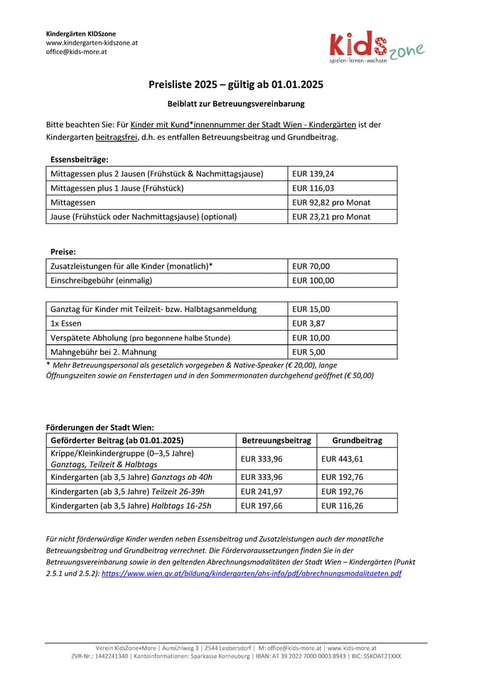 Durch die Förderung der Stadt Wien wird der Privatkindergarten KIDSzone12 als beitragsfreier Kindergarten geführt. Somit entfallen für Kinder mit Wiener Kindergartennummer Grund- und Betreuungsbeitrag.